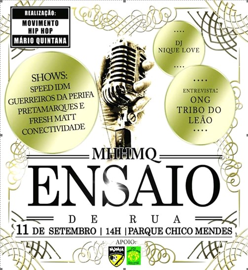 Ao lado Sander Bruw Chapa Halls criam o Movimento Hip Hop do Bairro Mario Quintana  que serviu de suporte para o evento Ensaio de Rua que teve 5 edições no ano de 2016.